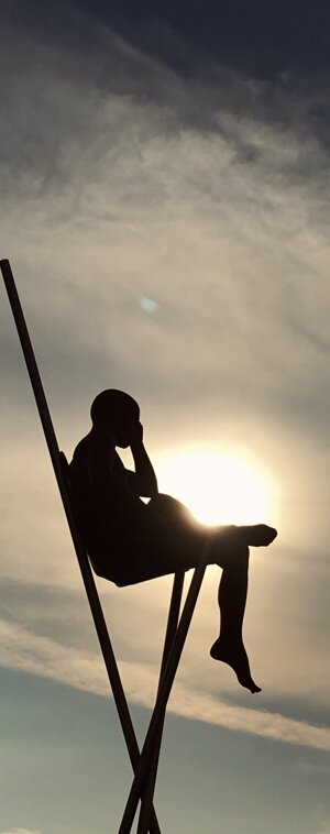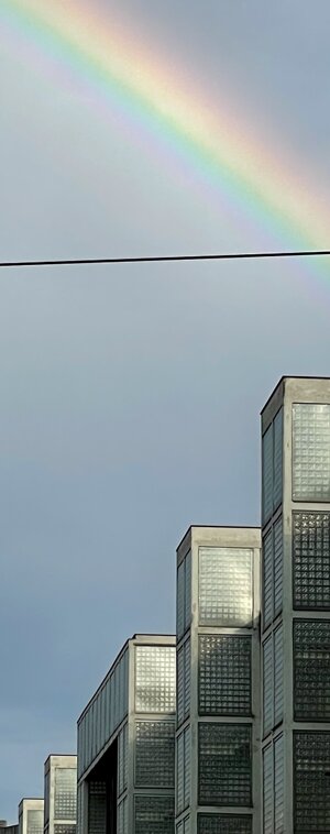 AV – “Thought brings up” wants to exacerbate the concept of solitude: the human being represented by the statue is completely isolated from the rest of the space. But loneliness, in this case, allows him to focus on his thoughts and in this way to rise above all those microcosms of people unable to communicate. The sunlight seems to give life to this spiritual elevation. “The perspective of the rainbow” wants to bring together nature and the work of man: in this case, the rainbow seems to arise from these anonymous concrete barracks, framed with a very strong perspective, as if to continue the curvature of the rainbow. In this case, I refer to the other theme of the exhibition, “future Landscapes” with the hope that the future can direct us towards urbanization that is as harmonious as possible with nature.